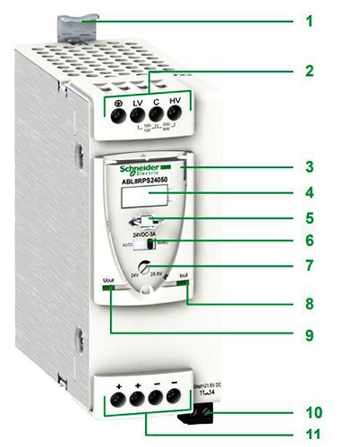 منبع تغذیه 480 وات از سری محصولات Phaseo اشنایدر الکتریک با جریان خروجی 20 آمپر است. اجزای این منبع تغذیه اشنایدر در زیر نشان داده شده است: